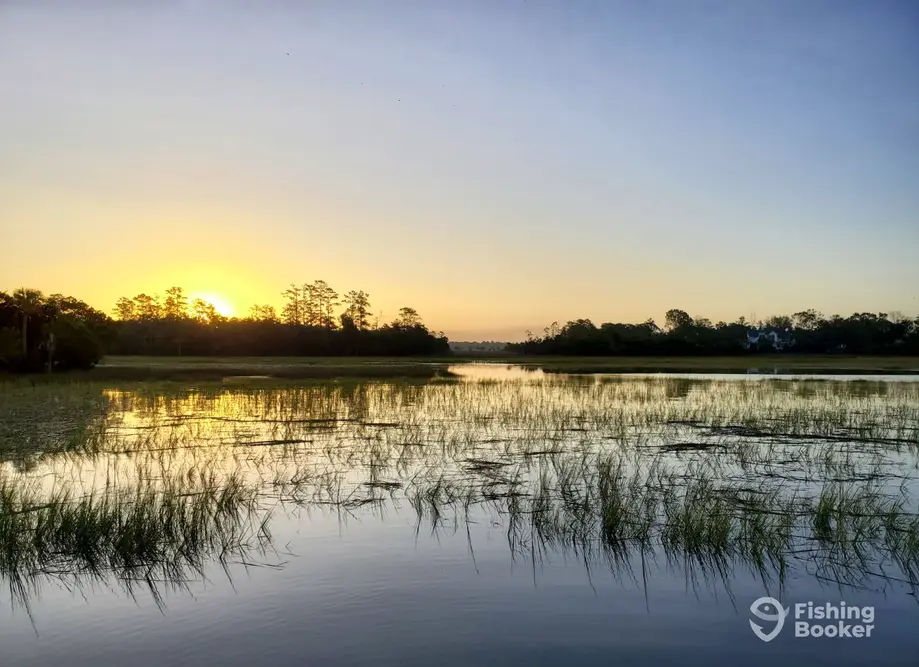 Your trip will start on a 2024 24' Bulls Bay center console 6 guests. It’s powered by a 250 HP Suzuki engine with a maximum cruising speed of 30 knots. The boat uses a trolling motor, power-pole, GPS, fish finder, and radio system for safe and quick navigation, and has got a live well to supply you with live bait.